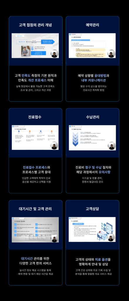 기존 자격증과 달리 “실무 교육”이 중심입니다. 이론과 CS 강의에 그치지 않고, 실제 병원 운영에 필수적인 부분(급여·비급여, 업무 분장, 환자 응대 등)을 상세히 다룹니다